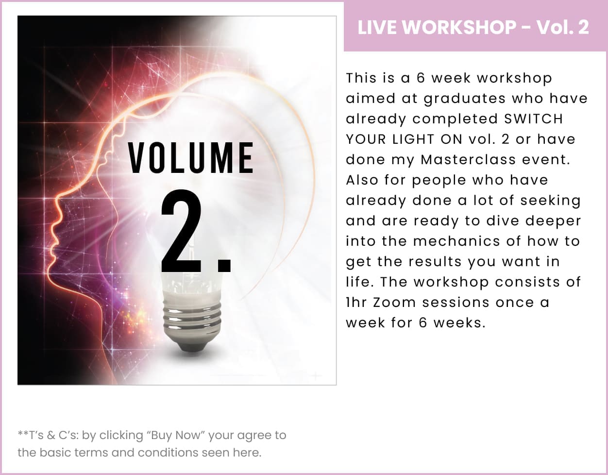 Click on the link below and you will spend the next 6 weeks reflecting and processing valuable information you have learnt from each of the sessions in this masterclass. This process will be accompanied by a free workbook and you can also diver deeper with your own copy of “Switch Your Light On”.